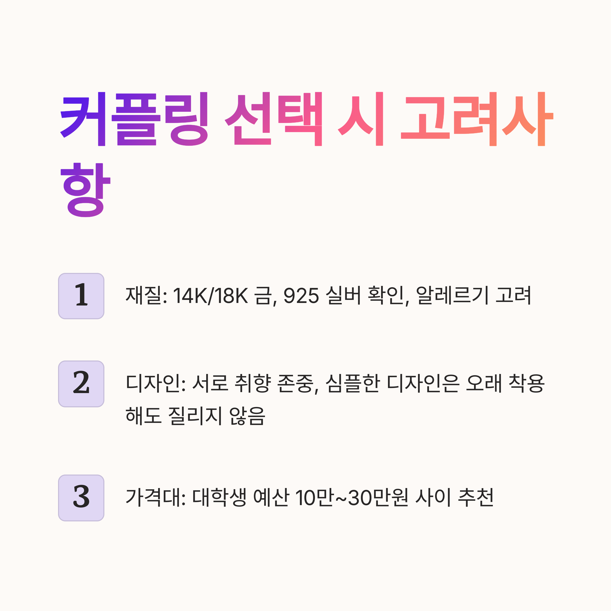 커플링은 매일 손에 닿는 아이템인 만큼 품질이 좋아야 하고, 오래 착용해도 변색이나 손상 없이 견고해야 해요. 또 디자인이 예뻐야 하고, 무엇보다 가격이 부담스럽지 않아야 하죠. 대학생들은 예산이 한정적인 경우가 많아 합리적인 가격대에서 좋은 품질을 찾는 게 가장 중요합니다.