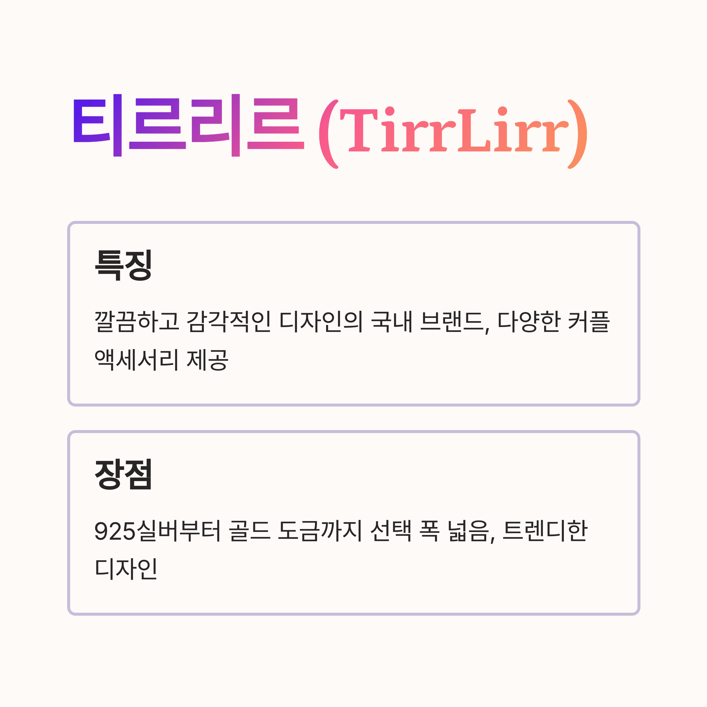 - 특징: 티르리르는 깔끔하고 감각적인 디자인이 돋보이는 국내 브랜드입니다. 커플링뿐 아니라 다양한 커플 액세서리까지 함께 구매할 수 있어 대학생들 사이에서 인기입니다.