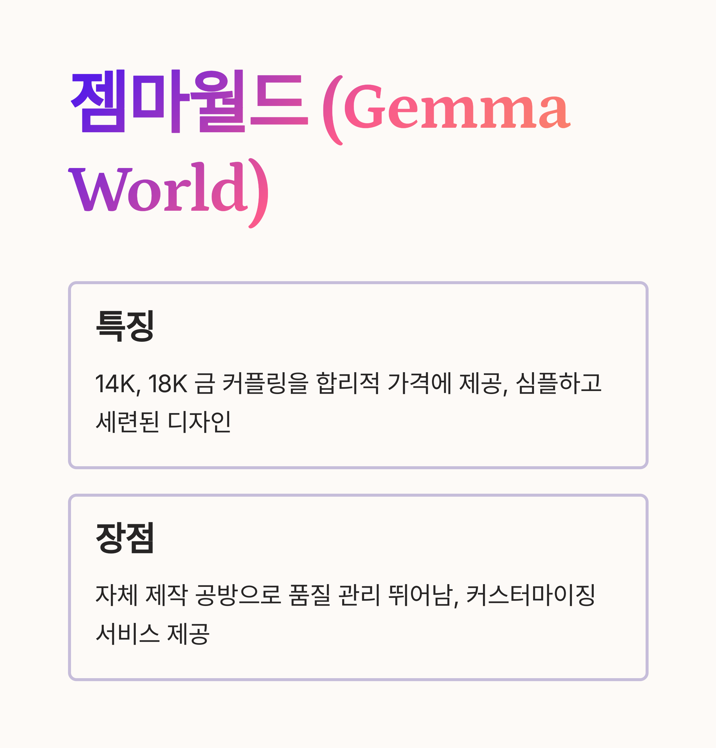 - 특징: 젬마월드는 14K, 18K 금 커플링을 합리적인 가격에 선보여 대학생 커플 사이에서 꾸준히 사랑받는 브랜드입니다. 특히 심플하면서도 세련된 디자인이 많아 데일리로 착용하기 좋아요.