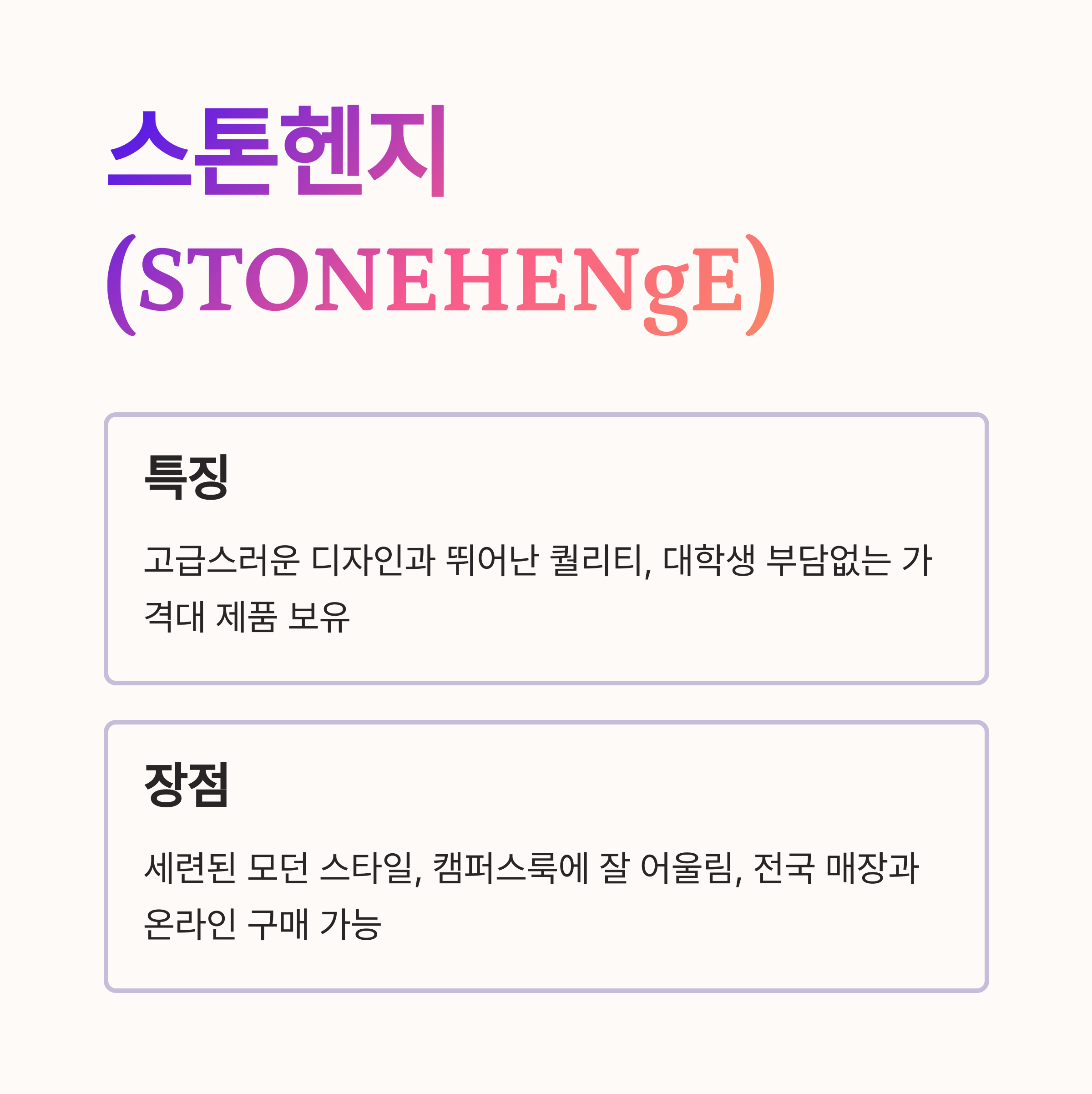 - 특징: 스톤헨지는 고급스러운 디자인과 뛰어난 퀄리티로 유명한 주얼리 브랜드지만, 대학생들이 부담없이 구매할 수 있는 가격대 제품도 많이 출시하고 있어요.
